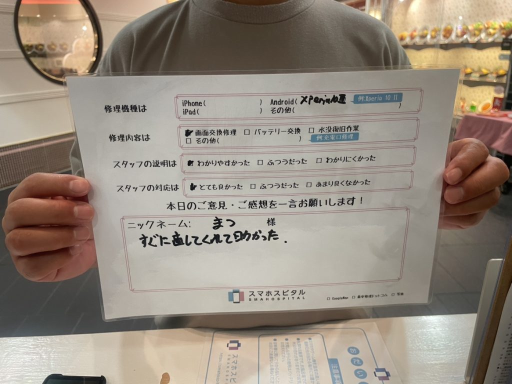 スマホスピタル名古屋駅前 Xperia10Ⅲ画面交換にてお客様の声を頂きました。