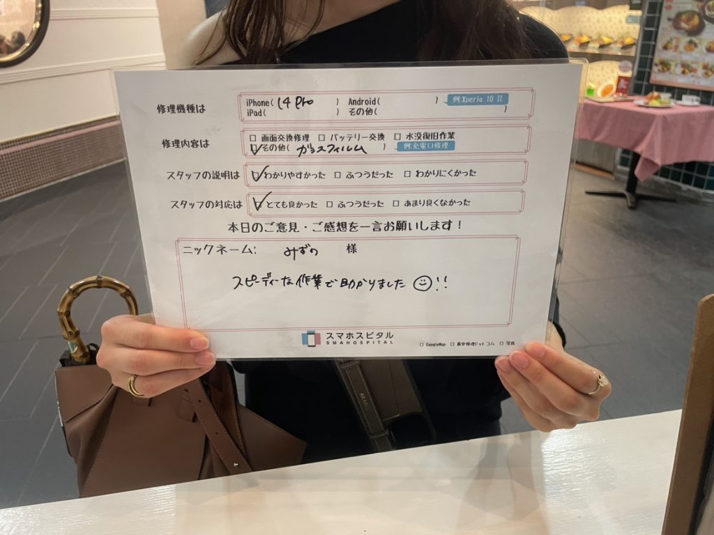 スマホスピタル名古屋駅前 iPhone14Proガラスフィルム+コーティング交換にてお客様の声を頂きました。