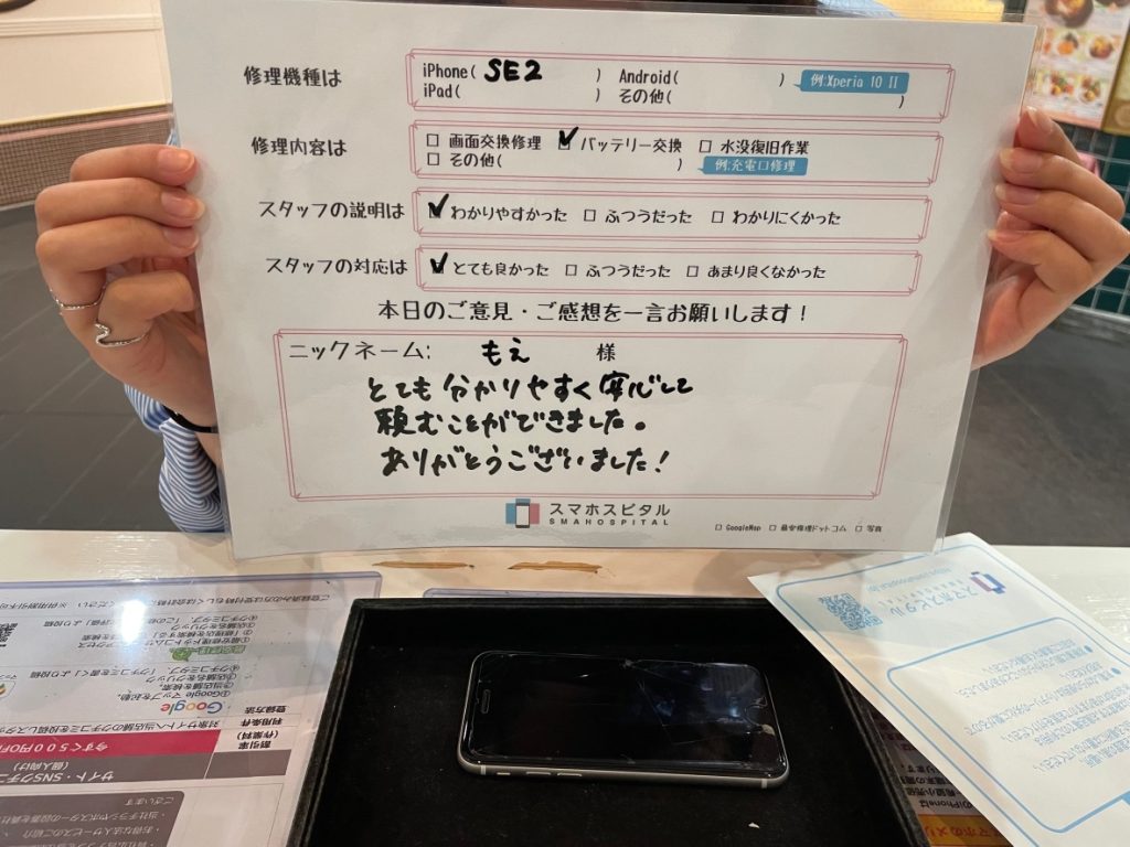 スマホスピタル名古屋駅前 iPhoneSE2バッテリー交換にてお客様の声を頂きました。
