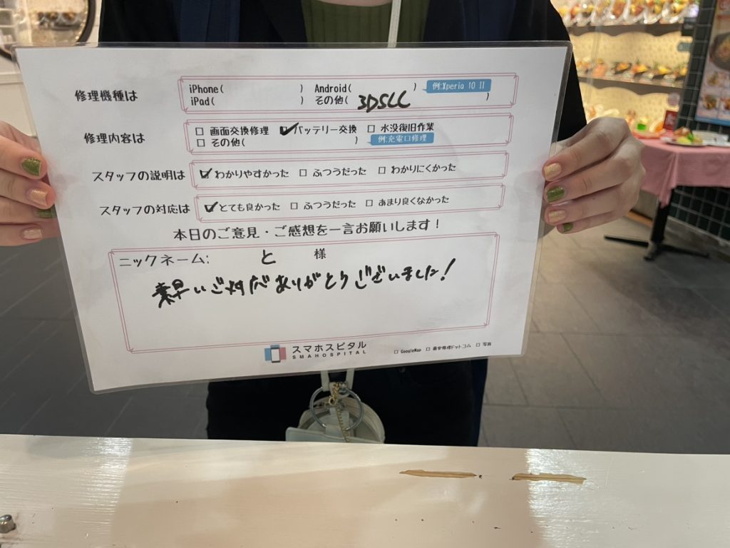 スマホスピタル名古屋駅前 3DSLLバッテリー交換修理にてお客様の声を頂きました。
