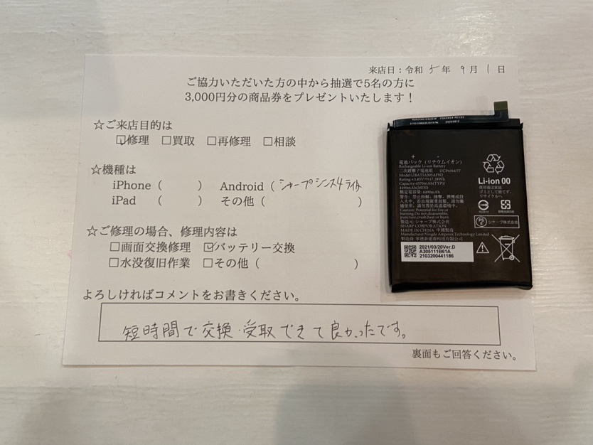 スマホスピタル名古屋駅前 AQUOS sense4liteのバッテリー交換でご依頼されたお客様よりお声を頂きました。