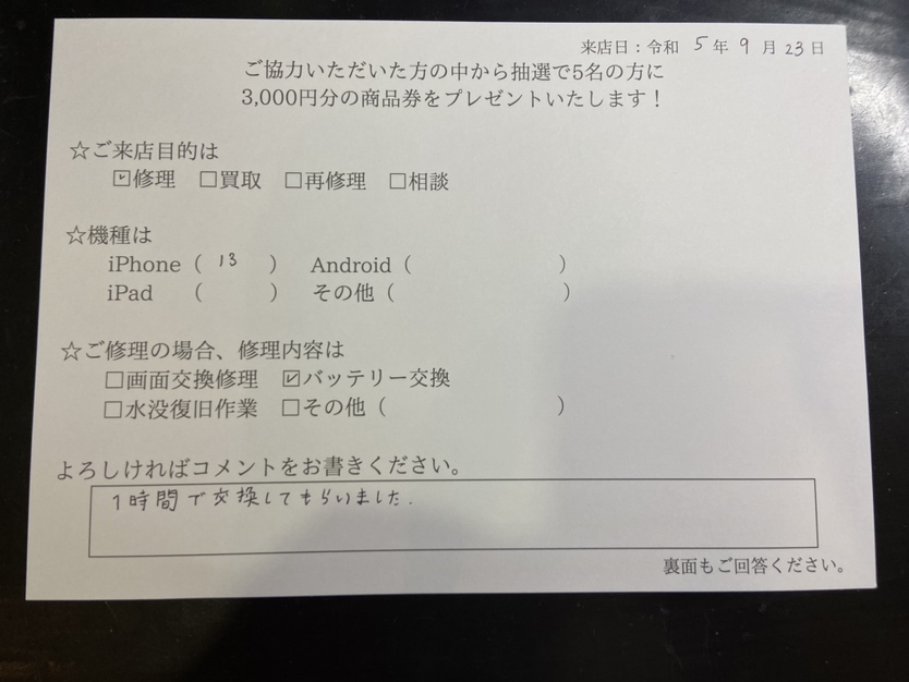 スマホスピタル名古屋駅前 iPhone13のバッテリー交換でご依頼されたお客様よりお声を頂きました。
