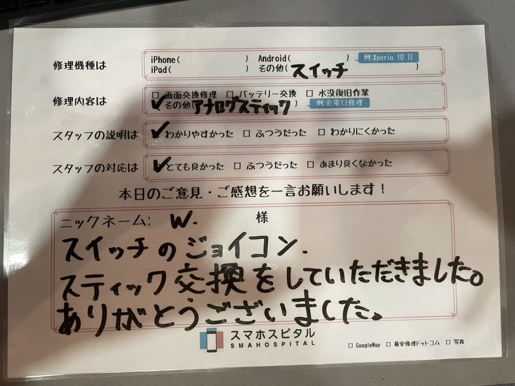 スマホスピタル名古屋駅前 スイッチのジョイコン、アナログスティック交換でご依頼されたお客様よりお声を頂きました。