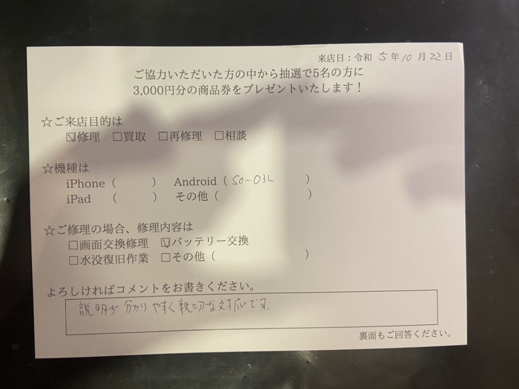 スマホスピタル名古屋駅前 Xperia1のバッテリー交換でご依頼されたお客様よりお声を頂きました。