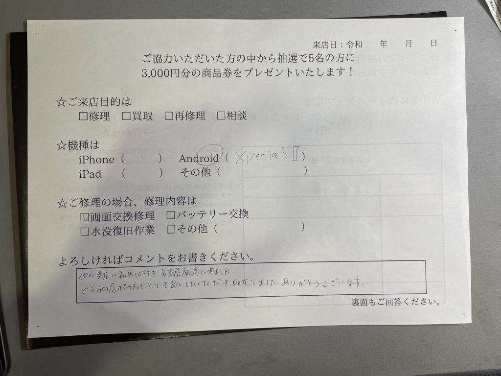 スマホスピタル名古屋駅前 Xperia5Ⅱ画面交換修理でご依頼されたお客様よりお声を頂きました。