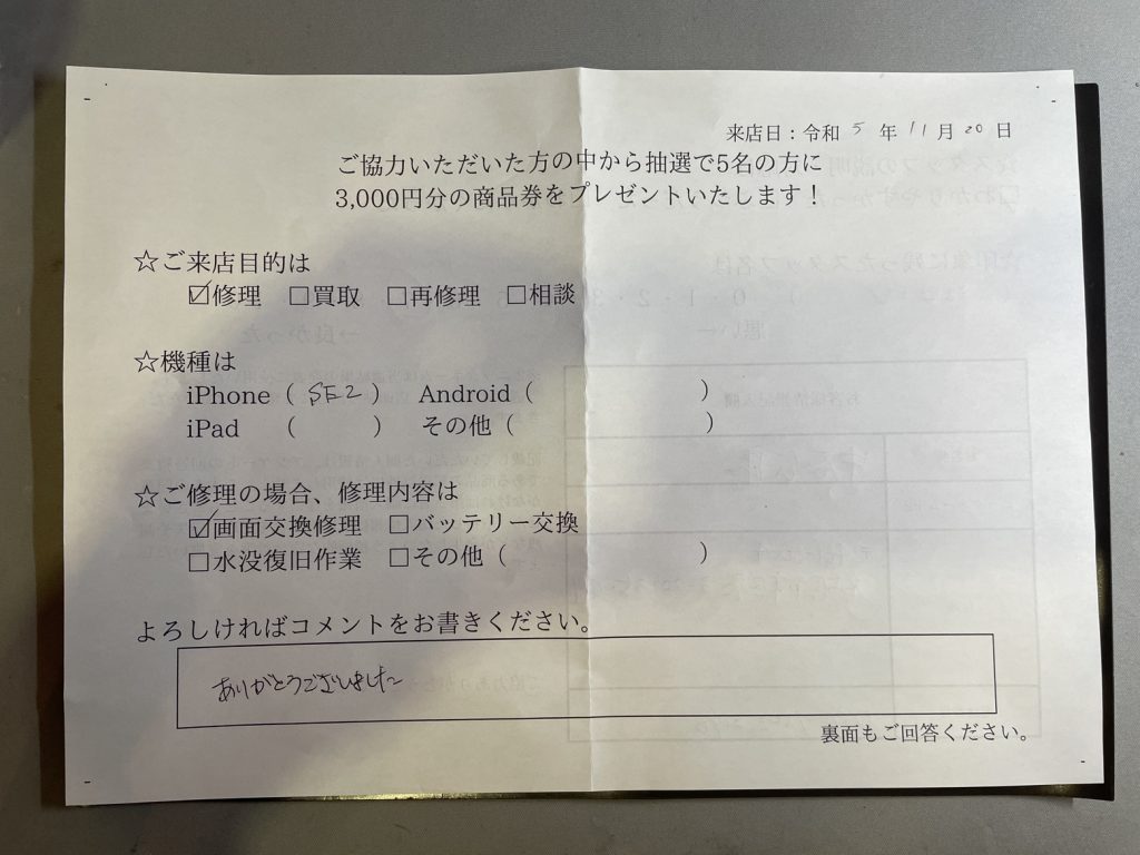 スマホスピタル名古屋駅前 iPhoneSE2の画面交換修理でご依頼されたお客様よりお声を頂きました。