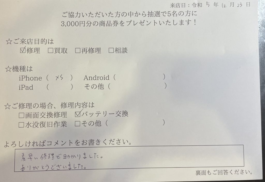 スマホスピタル名古屋駅前 iPhoneXSのバッテリー交換修理でご依頼されたお客様よりお声を頂きました。