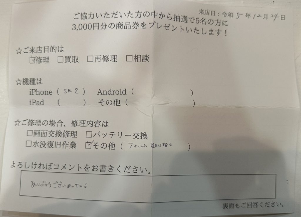 スマホスピタル名古屋駅前 iPhoneSE2のフィルム貼り替えでご依頼されたお客様よりお声を頂きました。