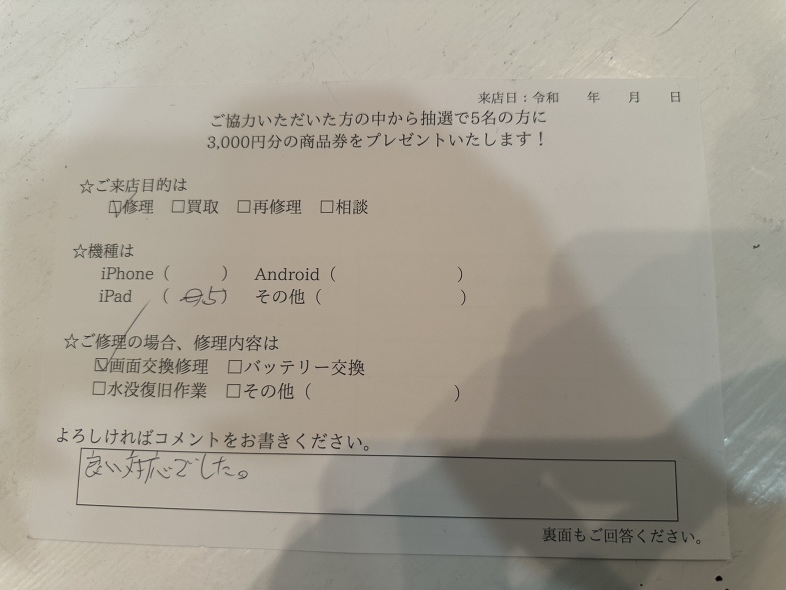 スマホスピタル名古屋駅前 iPad5ガラス交換修理でご依頼されたお客様よりお声を頂きました。