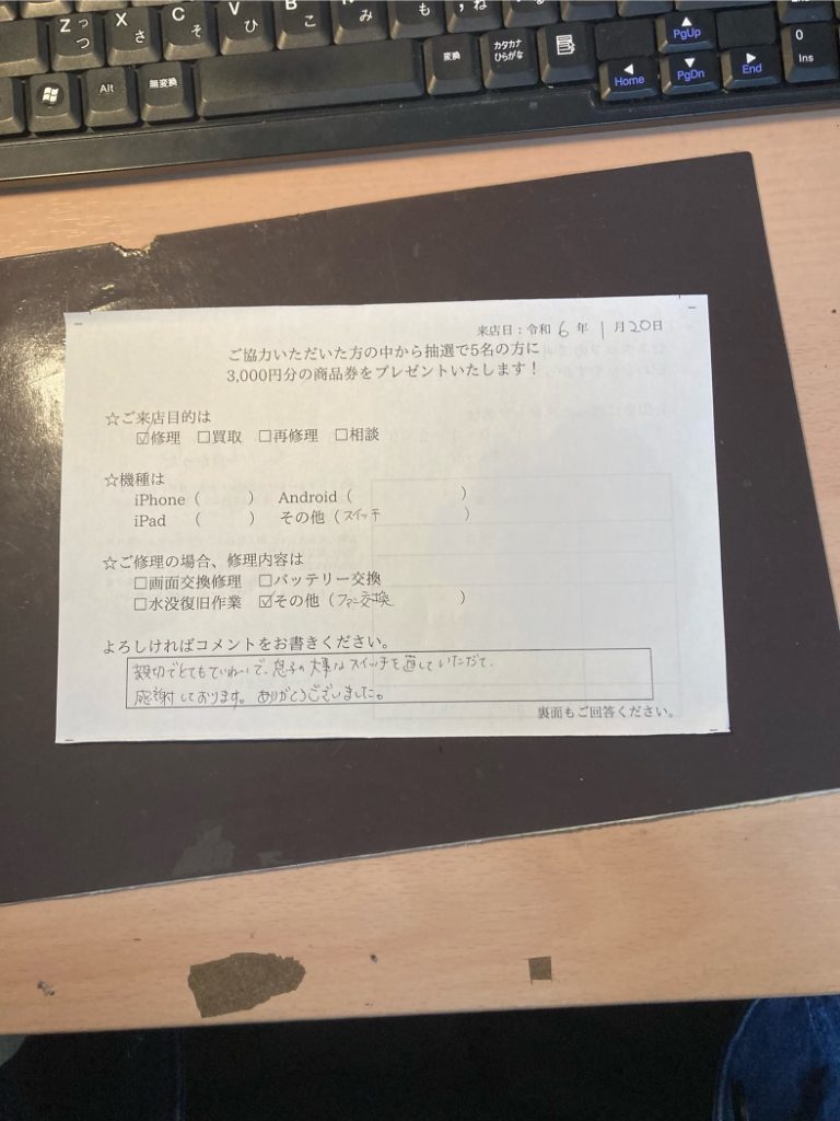 スマホスピタル名古屋駅前 Switchの冷却ファン交換修理でご依頼されたお客様よりお声を頂きました。