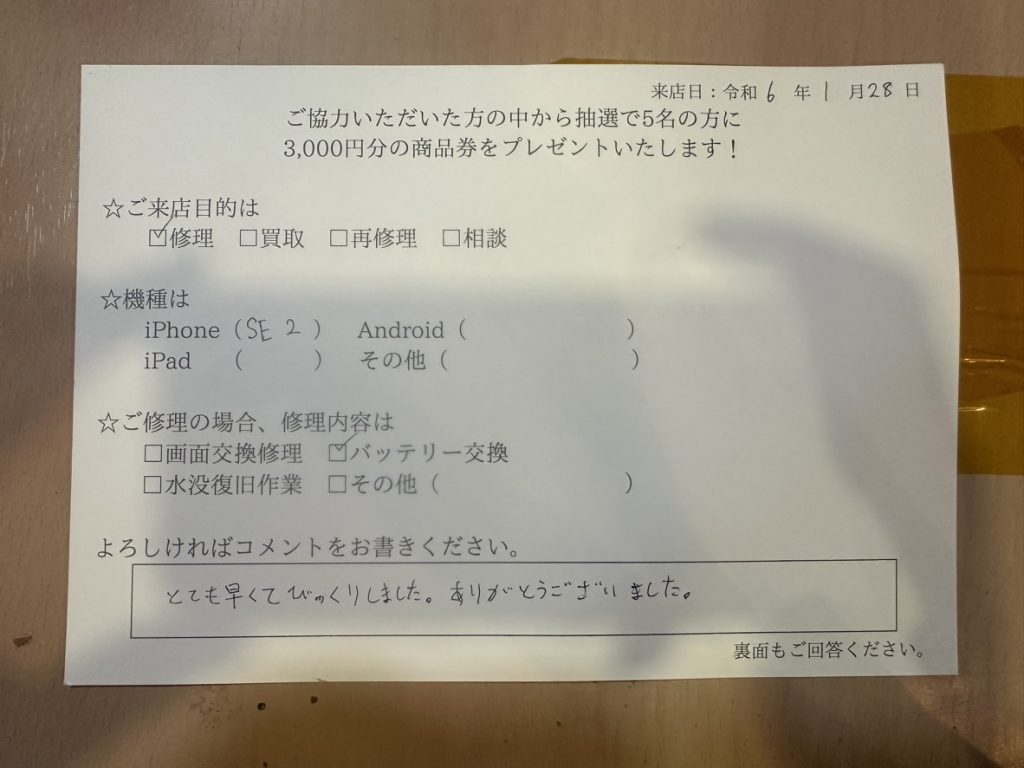 スマホスピタル名古屋駅前 iPhoneSE2のバッテリー交換修理でご依頼されたお客様よりお声を頂きました。