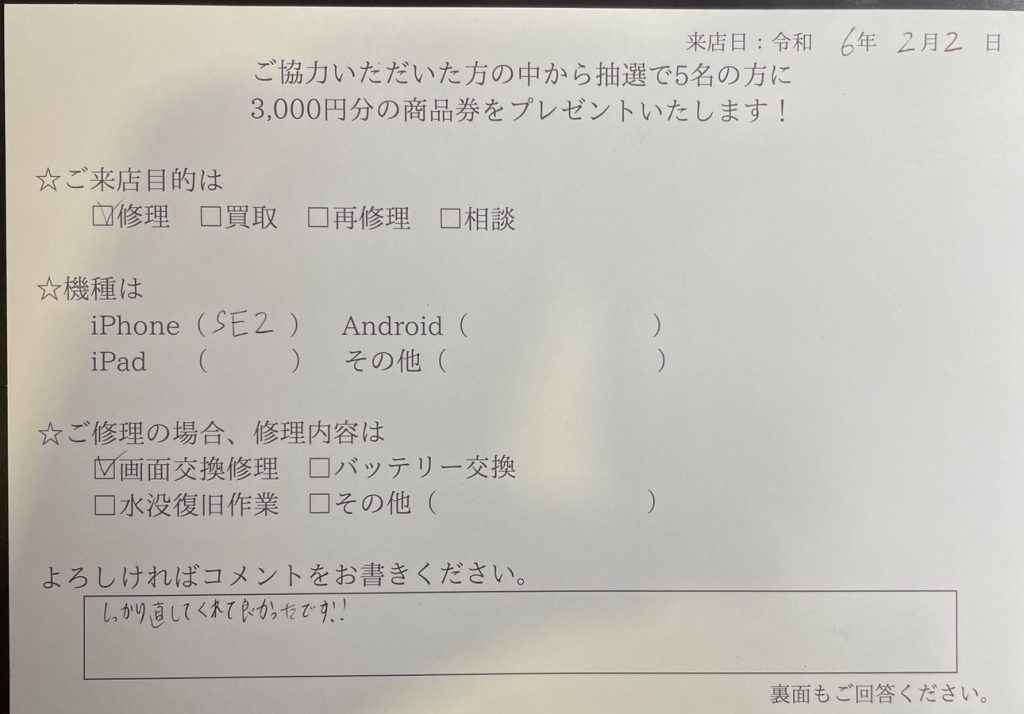 スマホスピタル名古屋駅前 iPhoneSE2の画面交換修理でご依頼されたお客様よりお声を頂きました。