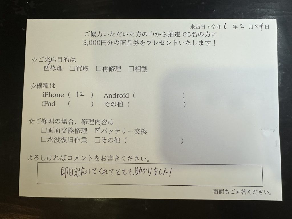 iPhone12のバッテリー交換修理でご来店いただきました。