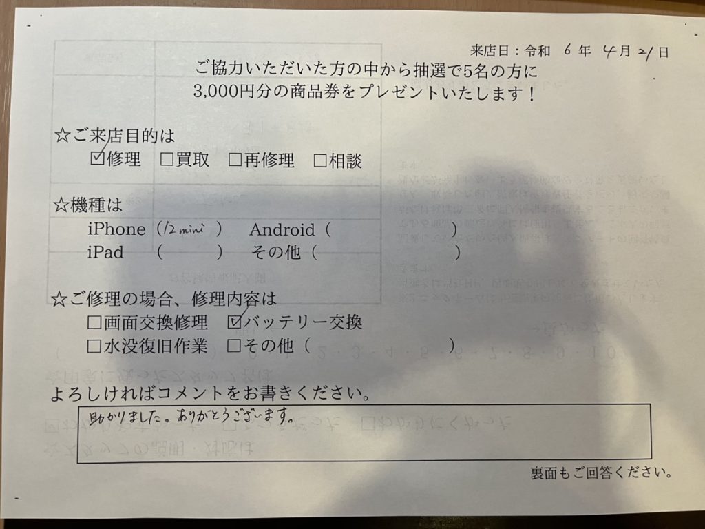 スマホスピタル名古屋駅前 iPhone12miniの大容量バッテリー交換をご依頼頂いたお客様からお声を頂きました。