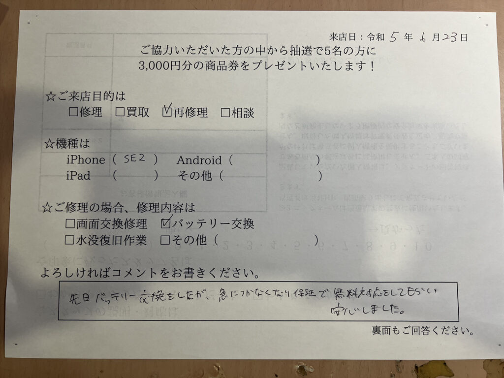 スマホスピタル名古屋駅前 iPhoneSE2のバッテリー再交換をご依頼頂いたお客様からお声を頂きました。