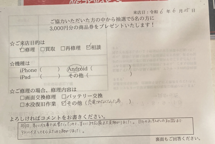 スマホスピタル名古屋駅前 OPPOReno5aの充電口メンテナンスをご依頼頂いたお客様からお声を頂きました。