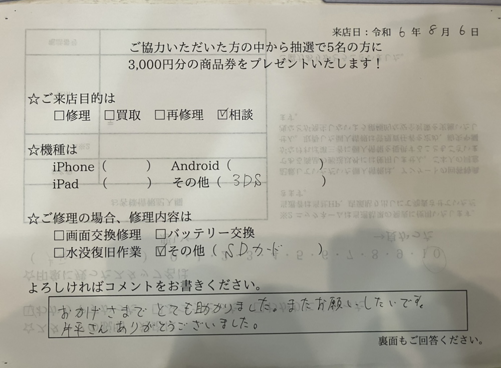 スマホスピタル名古屋駅前 3DSのSDカードスロットメンテナンスをご依頼頂いたお客様からお声を頂きました。