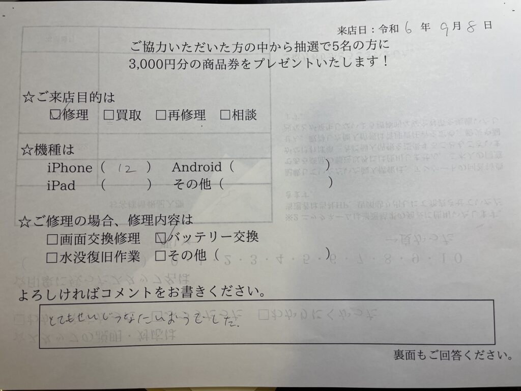 スマホスピタル名古屋駅前 iPhone 12の減りが早いとのことでバッテリー交換をご依頼のお客様に声をいただきました。