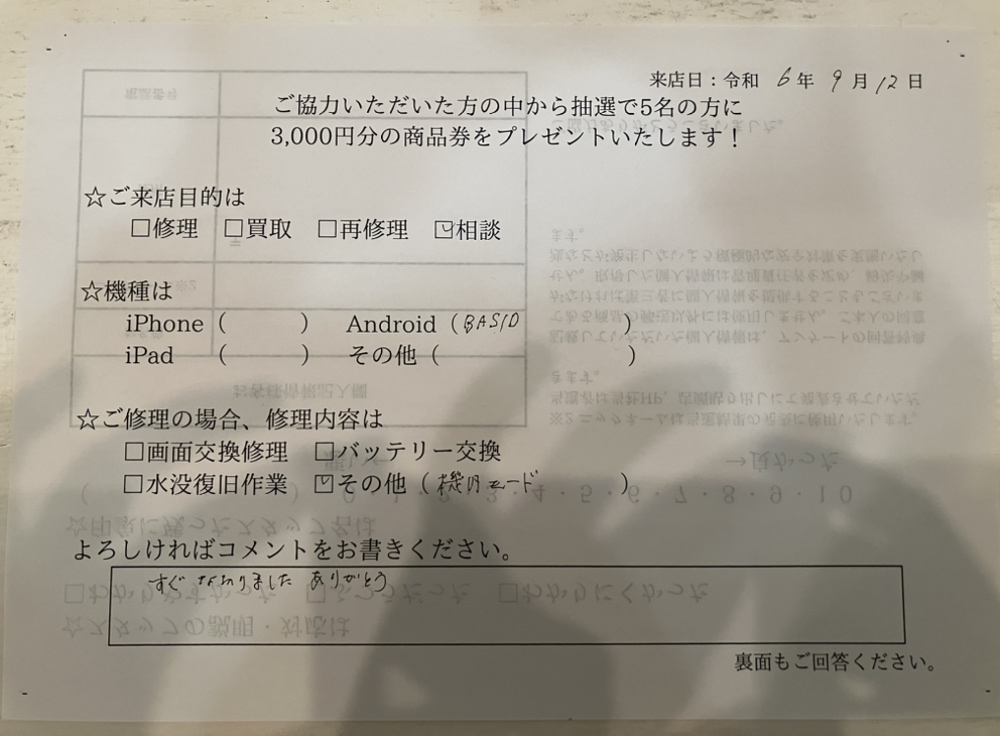 簡単スマホ(BASIO)が機内モードになり、電話が使えないとの事で相談して頂きました。