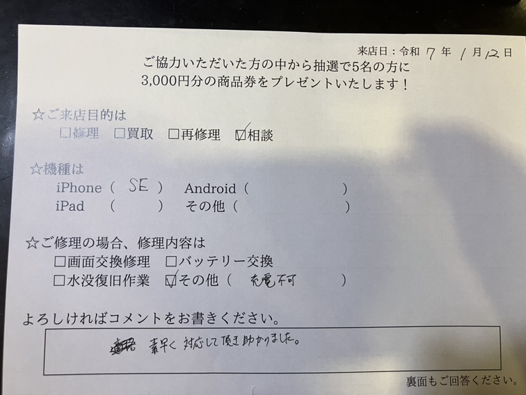 スマホスピタル名古屋駅前 iPhoneSEの充電不可の相談に来られたお客様からお声を頂きました。