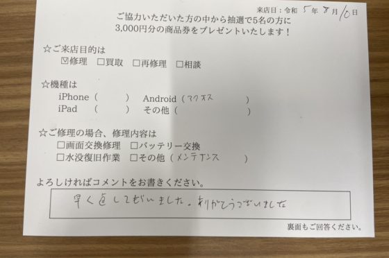 弊社の修理サービスをご利用いただいきましたお客様の声です。