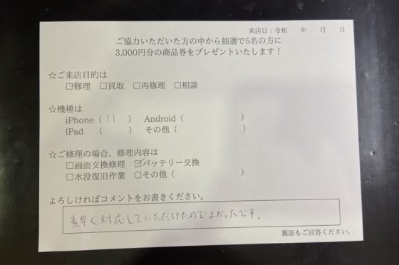 iPhone11のバッテリー交換されたお客様のお声を頂きました。