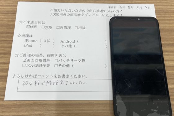 iPhoneXRの画面交換でご依頼されたお客様よりお声を頂きました。