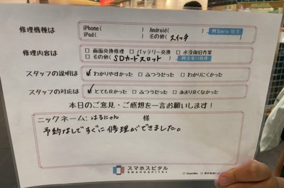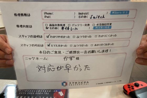 Switch SDカードスロット交換修理にてお客様の声を頂きました。