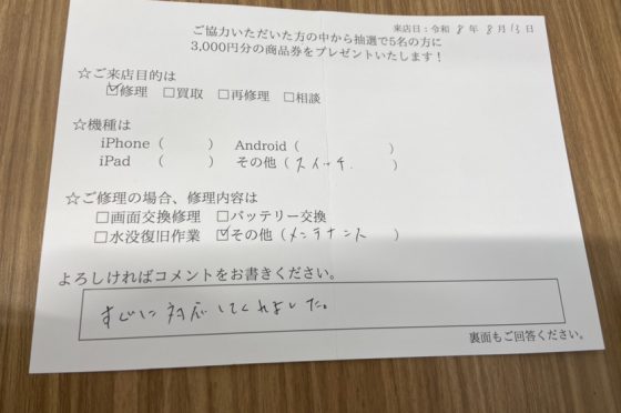 弊社の修理サービスをご利用いただいきましたお客様の声です。