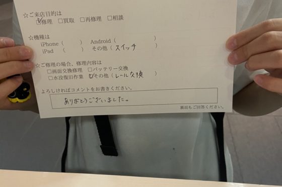 Switch本体レールの交換修理にてお客様の声を頂きました。