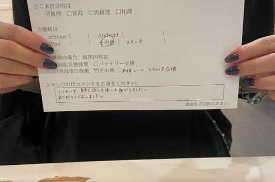 Switchの本体レールとスティック交換でご依頼されたお客様よりお声を頂きました。