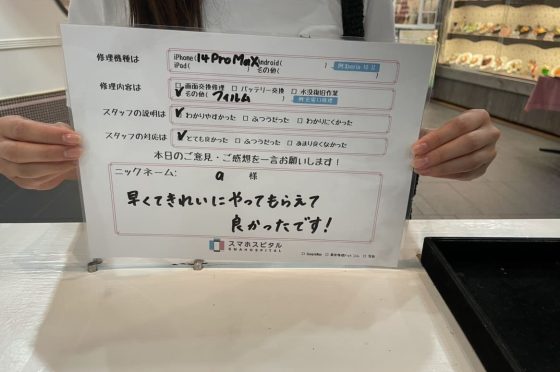 iPhone14Proガラスフィルム+コーティング交換にてお客様の声を頂きました。