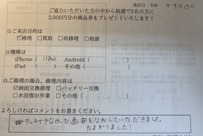 名前・返送先住所・連絡先・パスコード・故障内容をご記入のメモとご署名いただいた免責事項を同梱の上、端末と一緒にお送りください。