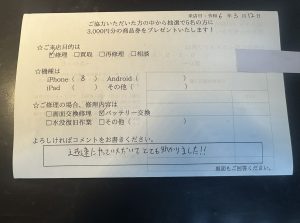 スマホスピタル名古屋金山 iPhone 8のバッテリー交換修理でご依頼されたお客様よりお声を頂きました。