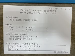 iPhone 11の画面交換修理でご依頼いただいたお客様からお声を頂きました!