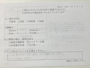 スマホスピタル名古屋金山 iPhone6Sのバッテリー交換でご依頼いただいたお客様からお声をいただきました!