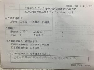 スマホスピタル名古屋金山 iPhoneSE(第二世代)のバッテリー交換修理を依頼されたお客様からお声を頂きました。