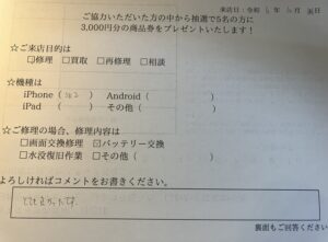 スマホスピタル名古屋金山 iPhone7のバッテリー交換修理を依頼されたお客様からお声を頂きました。