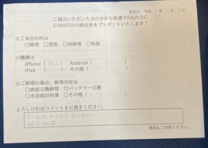 スマホスピタル名古屋金山 iPhone SE(第2世代)のバッテリー交換修理を依頼されたお客様からお声を頂きました。