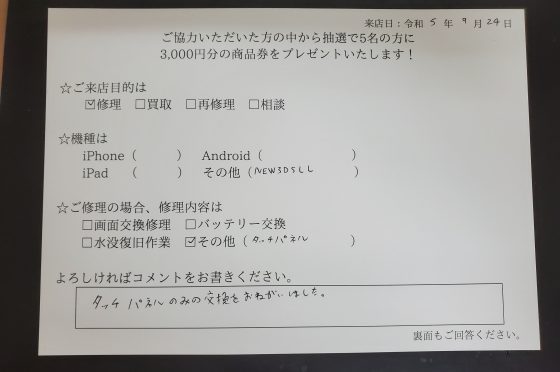 NEW3DSLLタッチパネル交換修理をしたお客様よりお声をいただきました。