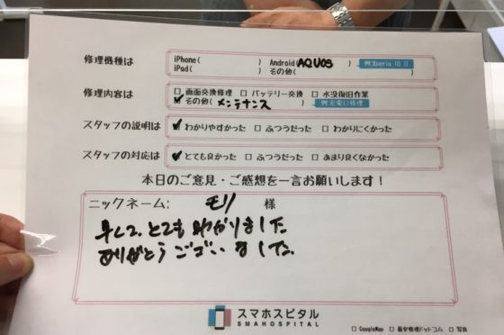 AQUOS Sense 4 liteのメンテナンス修理でお客様の声をいただきました!!