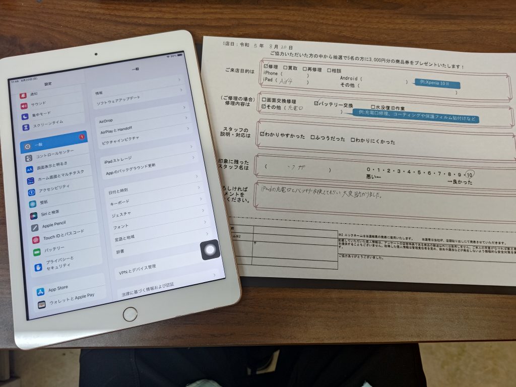iPadAirのバッテリーと充電口交換して頂きました!