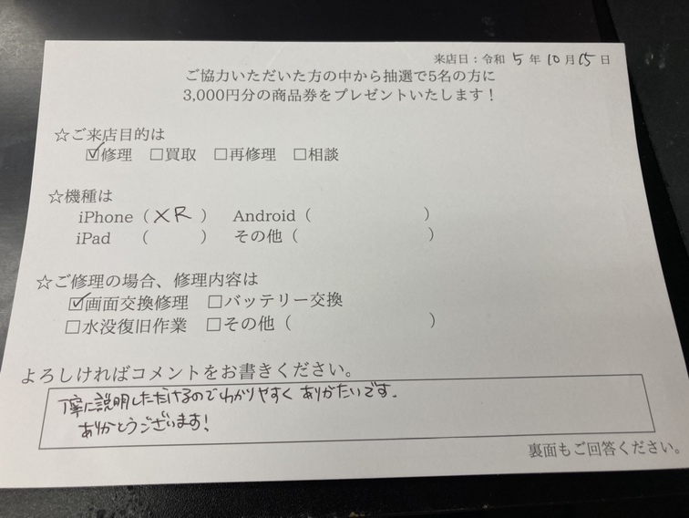スマホスピタル難波 液晶が破損して操作ができないiPhoneXRの修理を行ってもらいました
