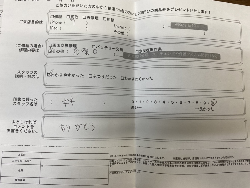 【お客様の声】iPhone7 のバッテリー交換をさせていただきました。