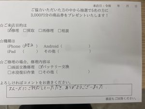 【お客様の声】iPhone7 のバッテリー交換をさせていただきました。
