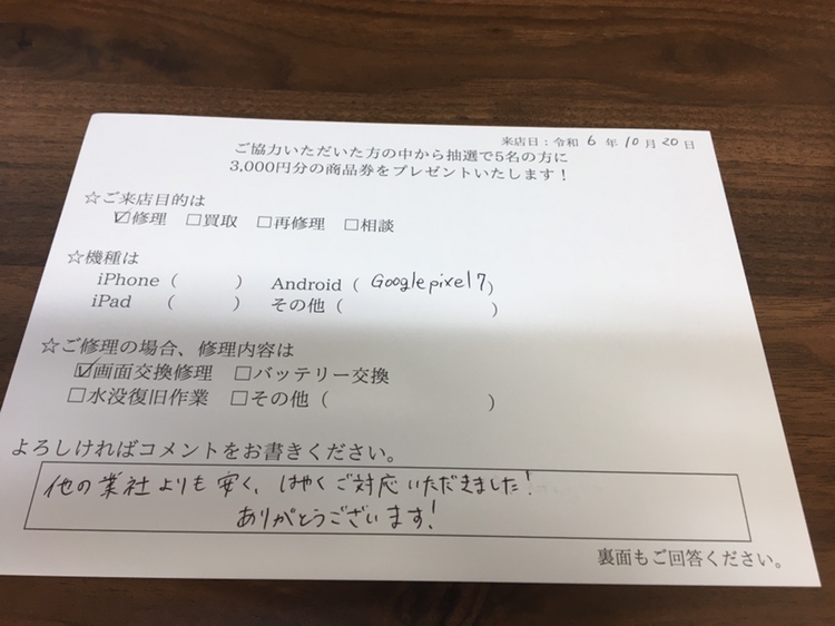 【お客様の声】Google Pixel 7 の画面交換を行いました。