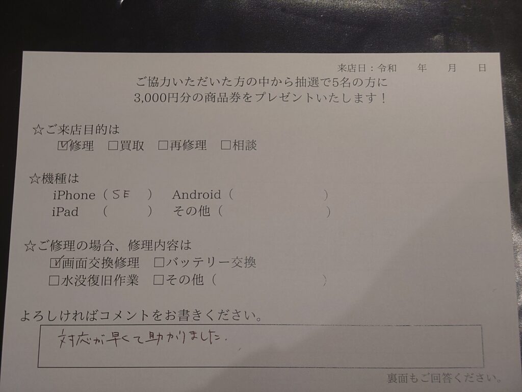【お客様の声】iPhoneSE第2世代の画面交換修理を行いました。