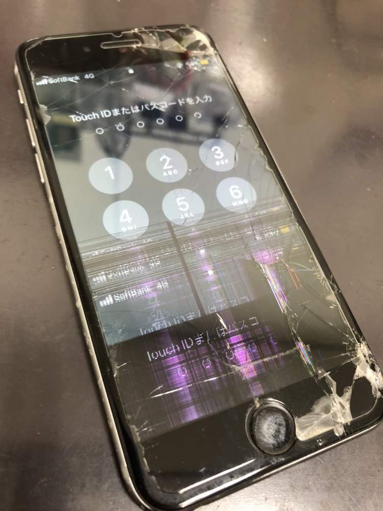 今回お持ちいただいたiPhone8も割れたまま使用していて、突然液晶が故障してしまったというものでした。