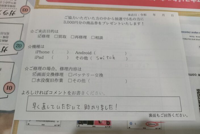 - スマホ修理、Switch修理、iPad修理など幅広い対応が可能