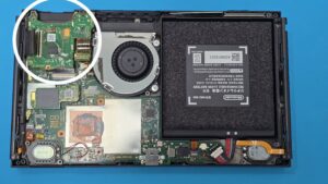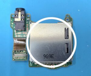 小さな基板になっており、丸で囲んだ部分がゲームソフトが入るスロット部分になります。